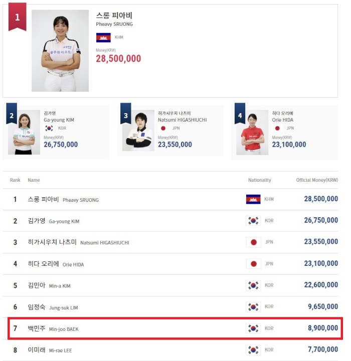 백민주 당구선수의 LPBA투어 상금 랭킹 순위